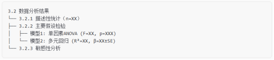 确保实验设计符合随机对照原则(RCT)或分层抽样,避免选择性偏倚使用标准化量表(如WHOQOL-BREF)并记录测量工具的信效度(Cronbach's α>0.7)保留原始数据存储凭证(如实验室日志、设备校准记录)lIQR法(全距法):Q1-1.5IQR ≤ X ≤ Q3+1.5IQRl单因素研究:ANOVA + 事后检验(Tukey HSD)l多因素研究:SEM结构方程模型 / MLM混合效应模型l纵向数据:GEE广义估计方程 / REML随机截距模型lOmega-squared(Ω²)替代p值作为效应量指标l使用Plotly/Power BI创建参数可调的可视化仪表盘l使用Cohen's forest plot展示多组比较l统计显著性:报告精确p值(如p=0.0032而非p<0.05)l临床意义:计算效应量的实际影响(如风险比HR=0.65对应15%绝对风险降低)l使用Jupyter Notebook创建数据分析流水线l注册预注册报告(如Open Science Framework)l检查样本量是否足够(使用G*Power计算功效)l采用Benjamini-Hochberg法控制FDRl预先登记分析计划(注册号:XXXX-XXXXX)通过以上系统性攻略,不仅能提升数据分析的科学严谨性,更能构建起完整的证据链体系。记住:统计显著性只是起点,真正的说服力来自效应量的临床价值、机制解释的合理性以及研究设计的严谨性。建议在论文初稿完成后,采用"盲审模拟"方式请同行评议,针对反馈意见迭代优化分析方案。--